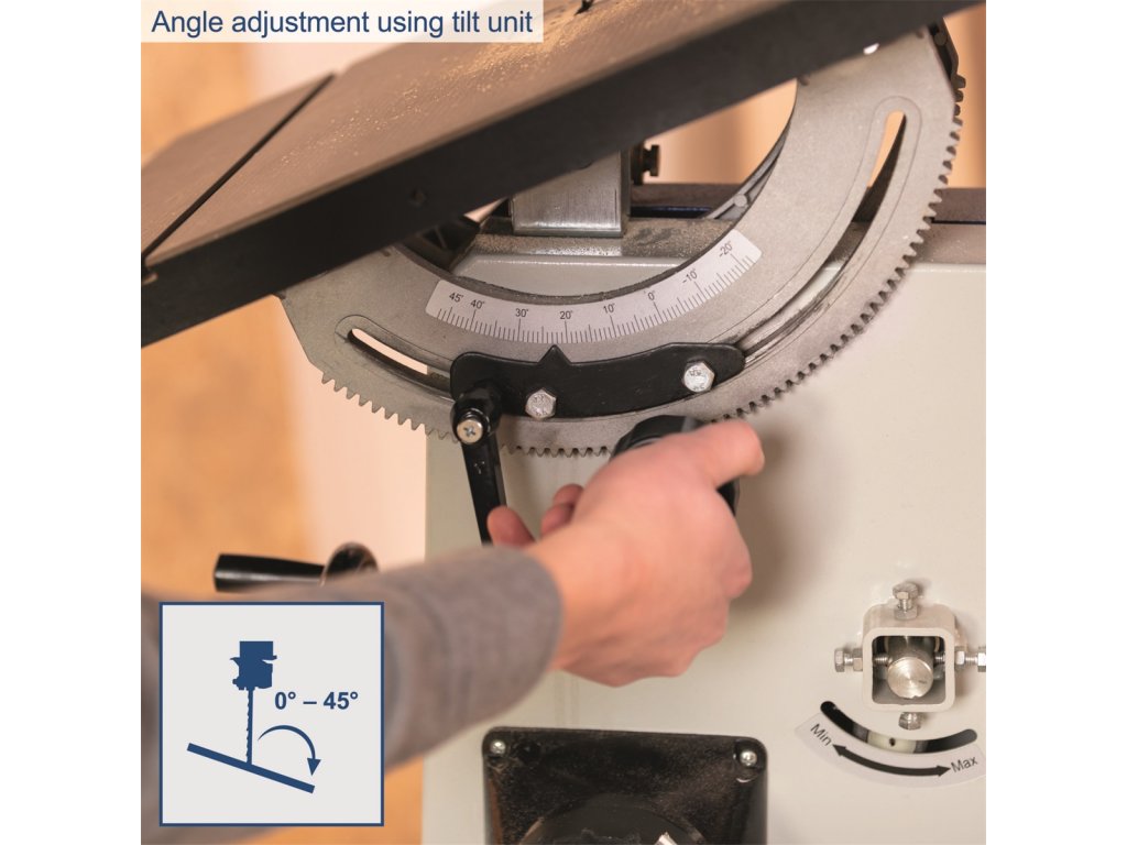 • Masívny stolík je vyrobený z liatiny a dá sa naklápať v rozmedzí -8 ° až + 45 °.